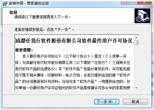 1、下载管家婆创业版压缩包并解压,双击exe安装程序,在许可协议界面点击“下一步”