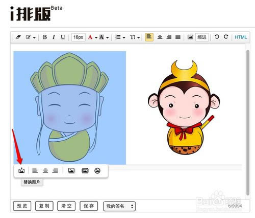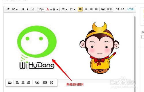 在选择了合适的滑动样式之后,接下来就可以替换自己的图片了。这个编辑器中有一个很便捷的“图片工具条”,点击示例图中的图片,然后选择第一个按钮即为“替换图片”。