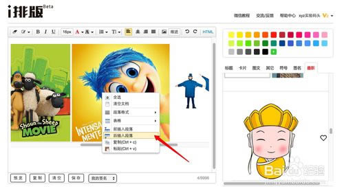 全部替换好图片后,接下来就需要放到微信后台了——从i排版到微信后台需要使用复制粘贴的方式进行操作,为了保险起见,可以现在该滑动样式上点击鼠标右键,选择:向后插入段落,保证全部内容都可以被复制进去。