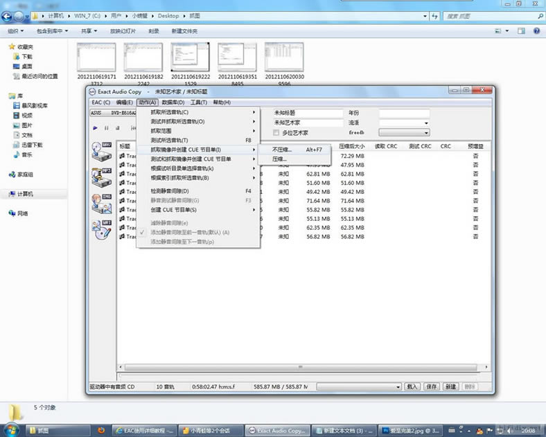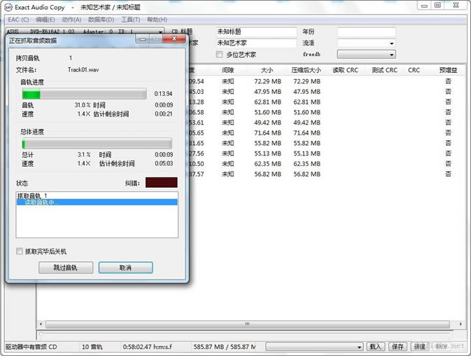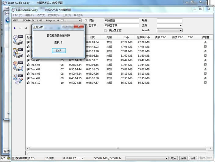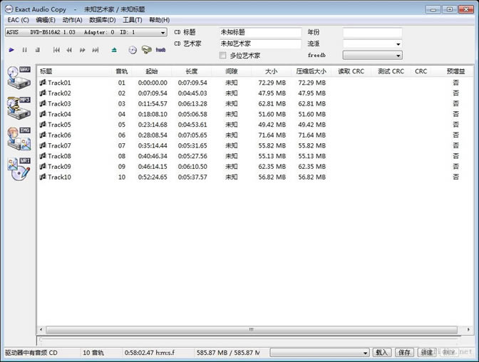 6、开始抓取 WAV音轨,用EAC抓取WAV音轨有两种方式,一种是抓取整张CD的整轨WAV文件与CUE文件,一种是抓取分开一首一首的单