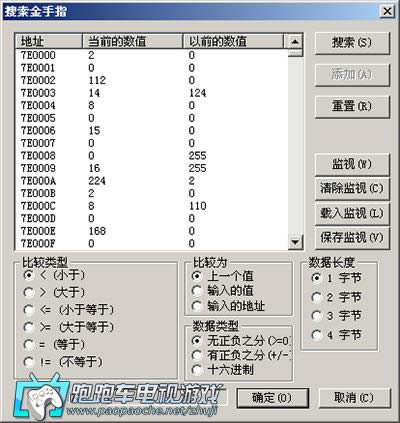 弹出这个对话框,左侧列表表示的是内存地址内容,下方的单选框组表示搜所条件。