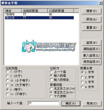 直接在最下面的输入栏,输入新的值77,然后点击搜索,然后就会惊喜的发现只剩下两条记录了,这两条记录表示的是,这两个地址从刚才的80变到了77.那证明这个地址就是用来存放生命值的啊。当然有两个地址的话,也有可能其中一个不是,那么可以依照上面的方法继续搜索排除。当然也有可能两个都是,先随便选一个点击【添加】