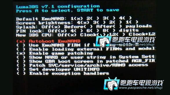 PS:开机显示An error has occured,Faild to apply 1 FIRM path(es),divss any button to shutdown错误:虚拟系统版本太低的祸,进luma界面除autoboot emuNAND选项以外的其他选项都不要选,看看能不能进虚拟系统。能进就升级虚拟系统解决,或者不升就这样。