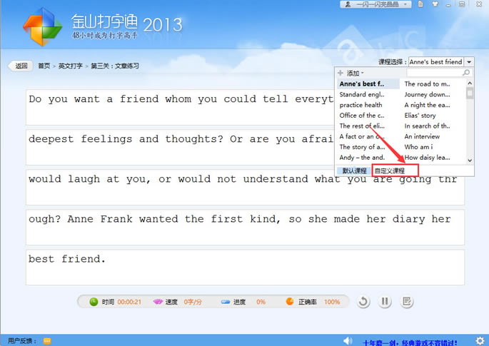 首先,打开金山打字通的英文打字—文章练习后,如图选择课程中,点击自定义课程。