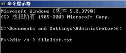 1、首先我们运行CMD打开DOS窗口,切换到?F?盘根目录。采用?dir?命令生成文件列表。