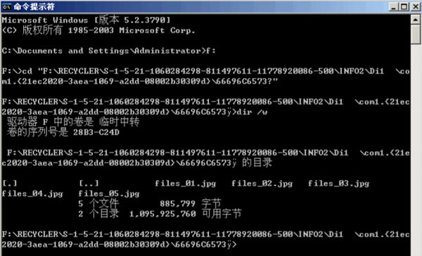4、从前面生成的文件列表中,复制加密文件存放路径,F:\RECYCLER\S-1-5-21-1060284298-811497611-11778920086-500\INFO2\Di1\com1.{21ec2020-3aea-1069-a2dd-08002b30309d}\66696C6573?