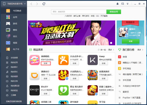 1、打开安装好的软件,将手机与电脑连接,找到自己喜欢的软件点击安装即可安装到手机