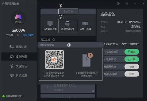 2、添加安卓设备点击“添加安卓设备”,可通过扫描二维码下载安卓客户端,安装后登录与本机相同的帐号密码,即可将主机添加至帐号下。
