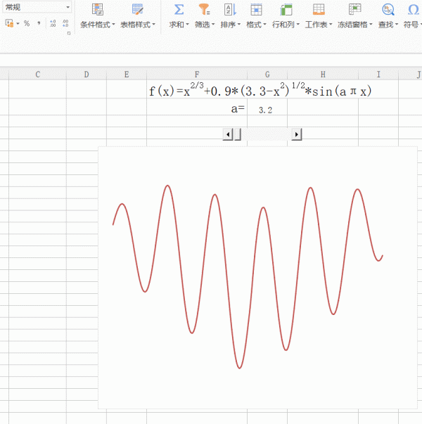 在”F1“单元格输入”y=sin(nθ/2) +(cos(nθ/2))^(2/3)“,”F2“单元格输入”=SIN(C2)+((COS(C2))^2)^(1/3)“,选中“F2”单元格,当指针变成黑色十字时,往下拖至“F202”。