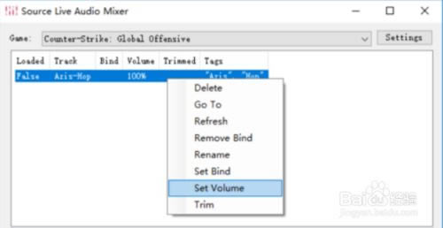 游戏选择CSGO,点击"Import" 导入音乐(最好是将音乐文件名称改成英文,中文在游戏里会是乱码,无法识别是哪首歌),点击"Play key"可以选择播放键。右击歌曲选择SetVolume,设置音量,软件的音量较大,建议改成50%左右。如下图所示: